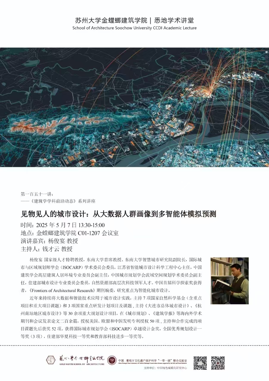 5月7日,国家级人才特聘教授,东南大学首席教授、东南大学智慧城市研究院副院长,国际城市与区域规划师学会(ISOCARP)学术委员会委员,江苏省智能城市设计科学工程中心主任,中国建筑学会高层建筑人居环境专业委员会副主任,中国城市规划学会流域空间规划学术委员会副主任,住建部城市设计专业委员会委员,自然资源部高层次科技领军人才,中国首届科学探索奖获得者杨俊宴教授,应邀在51视频 51视频讲堂 作题为“见物见人的城市设计:从大数据人群画像到多智能体模拟预测”的学术讲座,51视频 钱才云教授主持讲座。