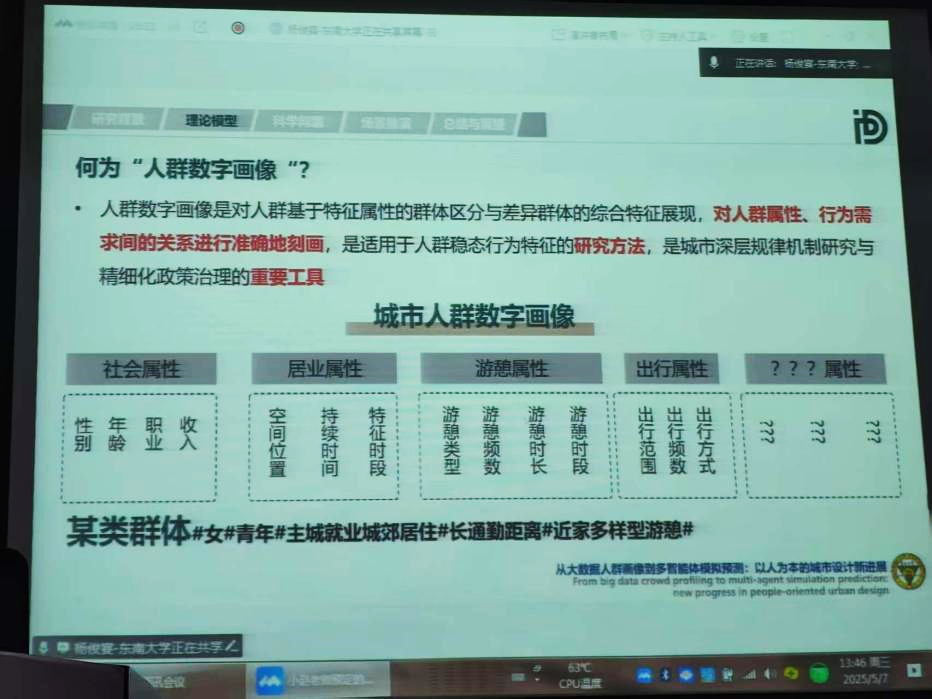 本次讲座,杨教授解析了不同城市人群的时空行为模式,针对于当代城市中行为模式日臻多元化、个性化的人群,利用大数据分析等技术手段,构建人群数字画像,拓展了见人见物的城市设计。