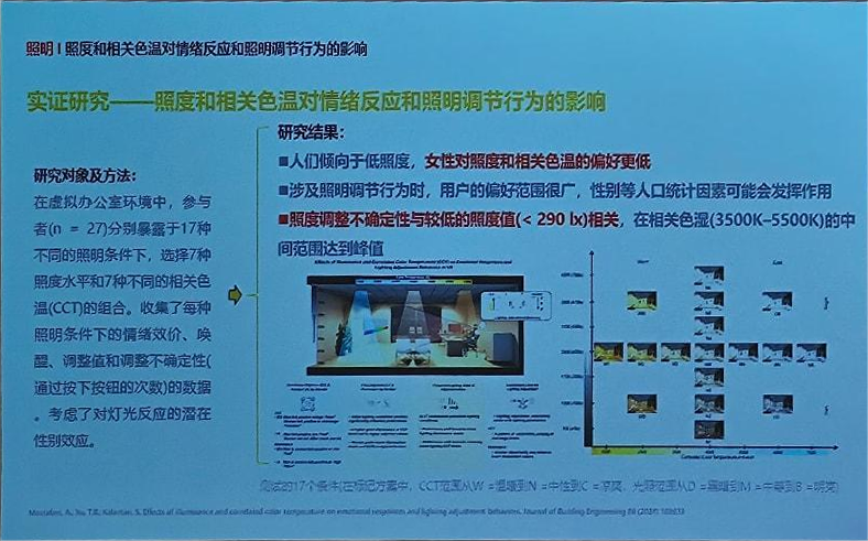 徐教授证实适宜的照明条件与较低的环境噪声水平能提升空间舒适度和空间感知,适度的照明和较低的噪声水平更令人愉悦,非常明亮的照明与强烈的噪声相结合则会让人感到不适和分心。拥有充足照明和可听噪声水平的环境能减轻慢性压力带来的负面影响,接触自然光和自然声音有助于降低皮质醇水平,促进放松和整体的幸福感,而暴露在强光和噪声中会提高心率、血压以及其他与压力相关的生理指标。