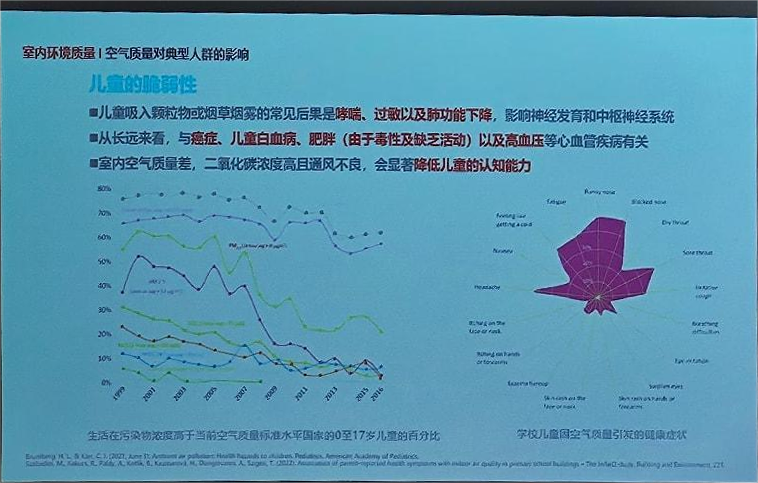 空气质量对老人、儿童的负面影响尤为明显。儿童对空气污染和温度变化高度敏感,儿童吸入颗粒物或烟草烟雾的常见后果是哮喘、过敏以及肺功能下降,影响神经发育和中枢神经系统。从长远来看,空气质量与癌症、儿童白血病、肥胖以及高血压等心血管疾病有关;室内空气质量差,二氧化碳浓度高且通风不良,会显著降低儿童的认知能力。而老年人由于身体调节能力减弱,尤其在清晨温差较大时,更容易出现脑卒中等健康问题。