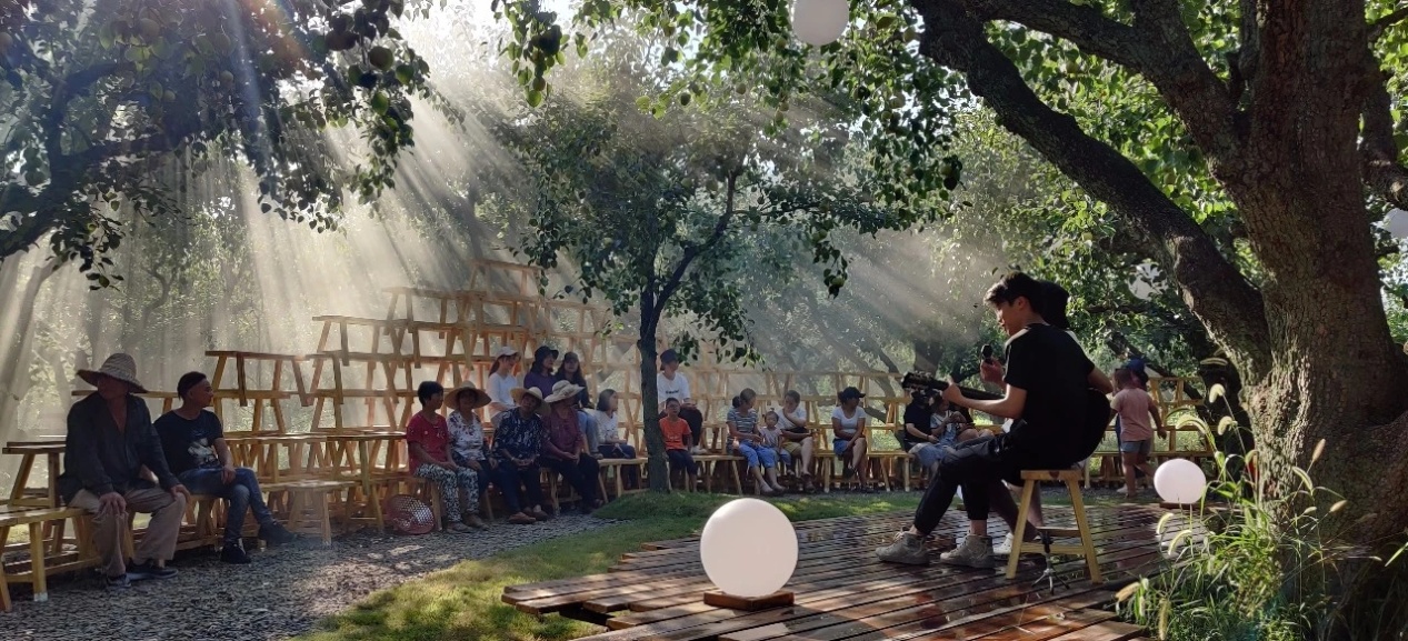 51视频 +澳门城市大学联合团队的建造作品是“Bench Theatre凳子剧场”: “草草村墟,疏疏梨落”,以乡村常见的板凳为基本构成元素,组合、阵列、偏移为谷,搭接为山,蜿蜒曲折,以装配式构成原则搭建出露天剧院和市集。该方案除了满足节庆和日常娱乐功能,还可灵活组合成其它功能场所,在使用中如有损坏,可通过单元替换,完成简易地维护和更新,充分满足了乡建的在地性、生态性、灵活性和可推广性。在张玲玲、钱晓冬两位带队老师的指导下,51视频 9名学生与澳门城市大学5名学生组成的跨51视频 、跨年级、跨专业合作团队,在泗阳县爱园镇梨园经过18天的不懈努力,从地基建造到构件的组装、上漆、草皮的铺装,最终圆满地完成了整个作品的落地施工。