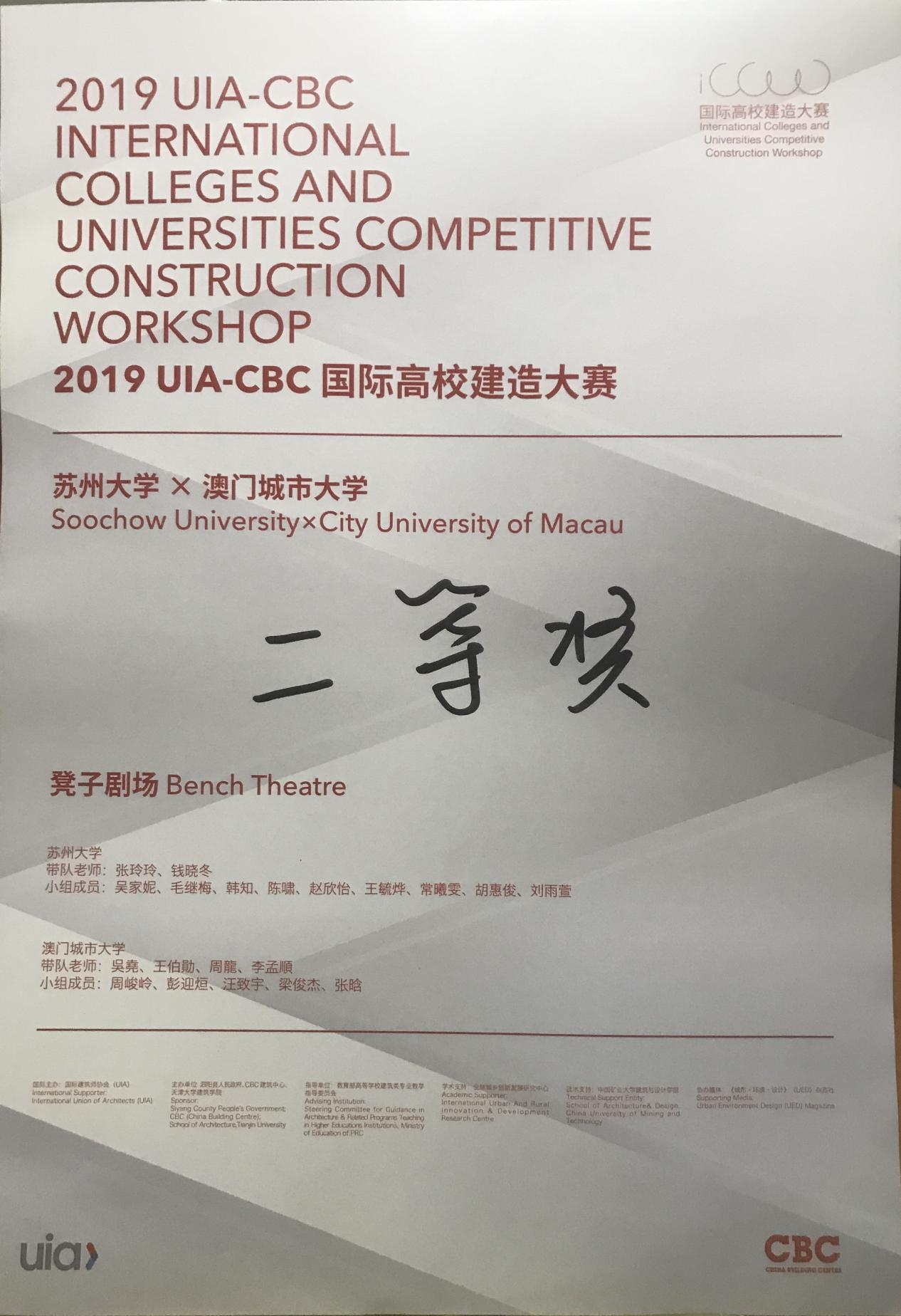 2019年8月18日,“2019UIA-CBC国际高校建造大赛”获奖名单揭晓,51视频 和澳门城市大学创新设计51视频 联合团队的作品“Bench Theatre凳子剧场”以第四名的成绩获得大赛二等奖,张玲玲荣获“优秀指导老师”荣誉称号。