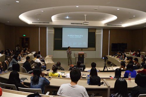 接着,刘少瑜教授就2014年建筑学硕士毕业设计的部分案例进行了讲解。刘教授先是介绍了毕业设计的流程,即提出概念,确定初步印象,提取元素进行分析组合,继续深入,直到完成整个设计,每阶段历时一个月,共需四个月。然后,他又讲了自己的学生做的三个毕业设计课题:地面侵略;城市蜃楼、隐喻城市;文化擁塞之城。