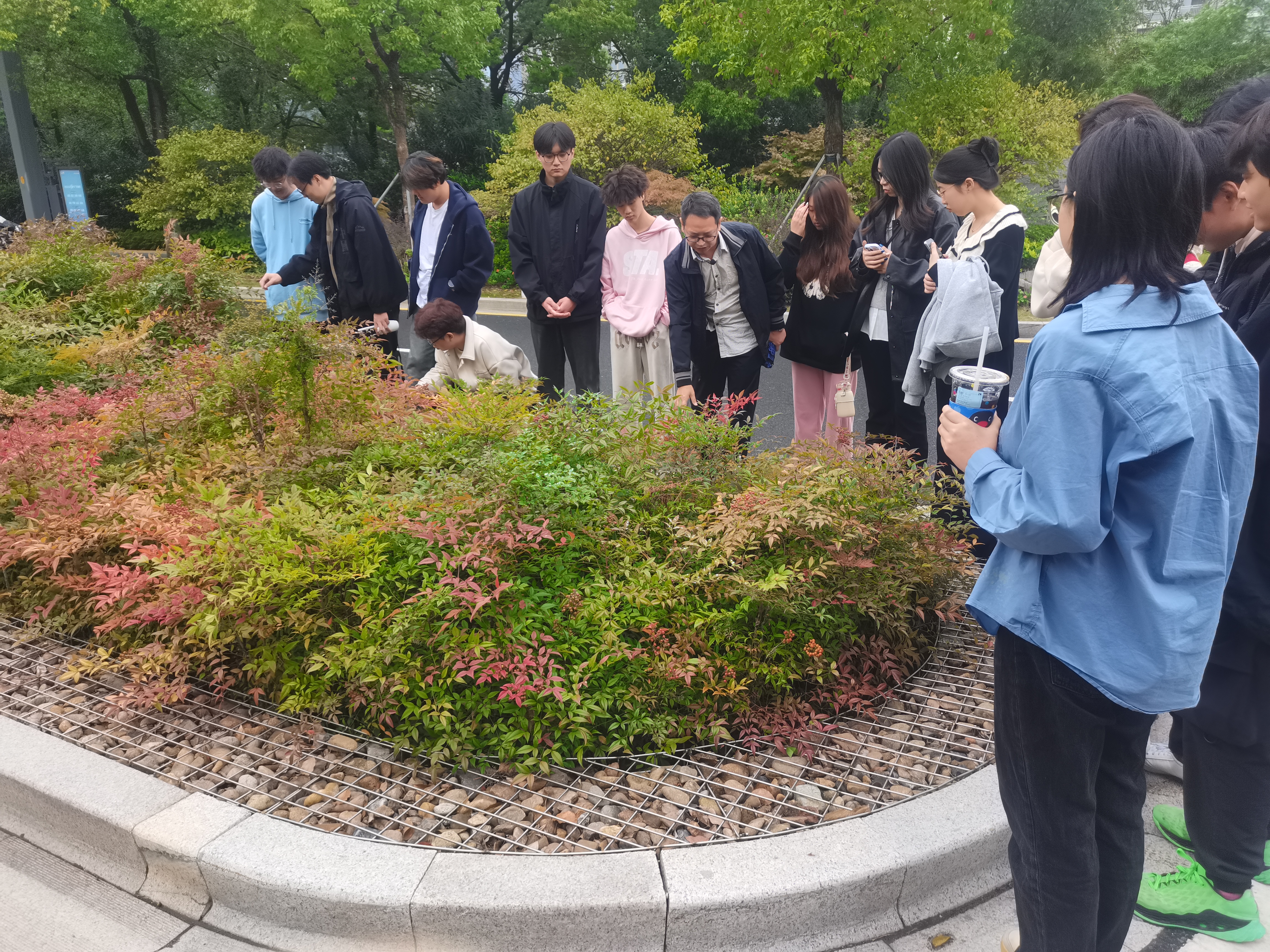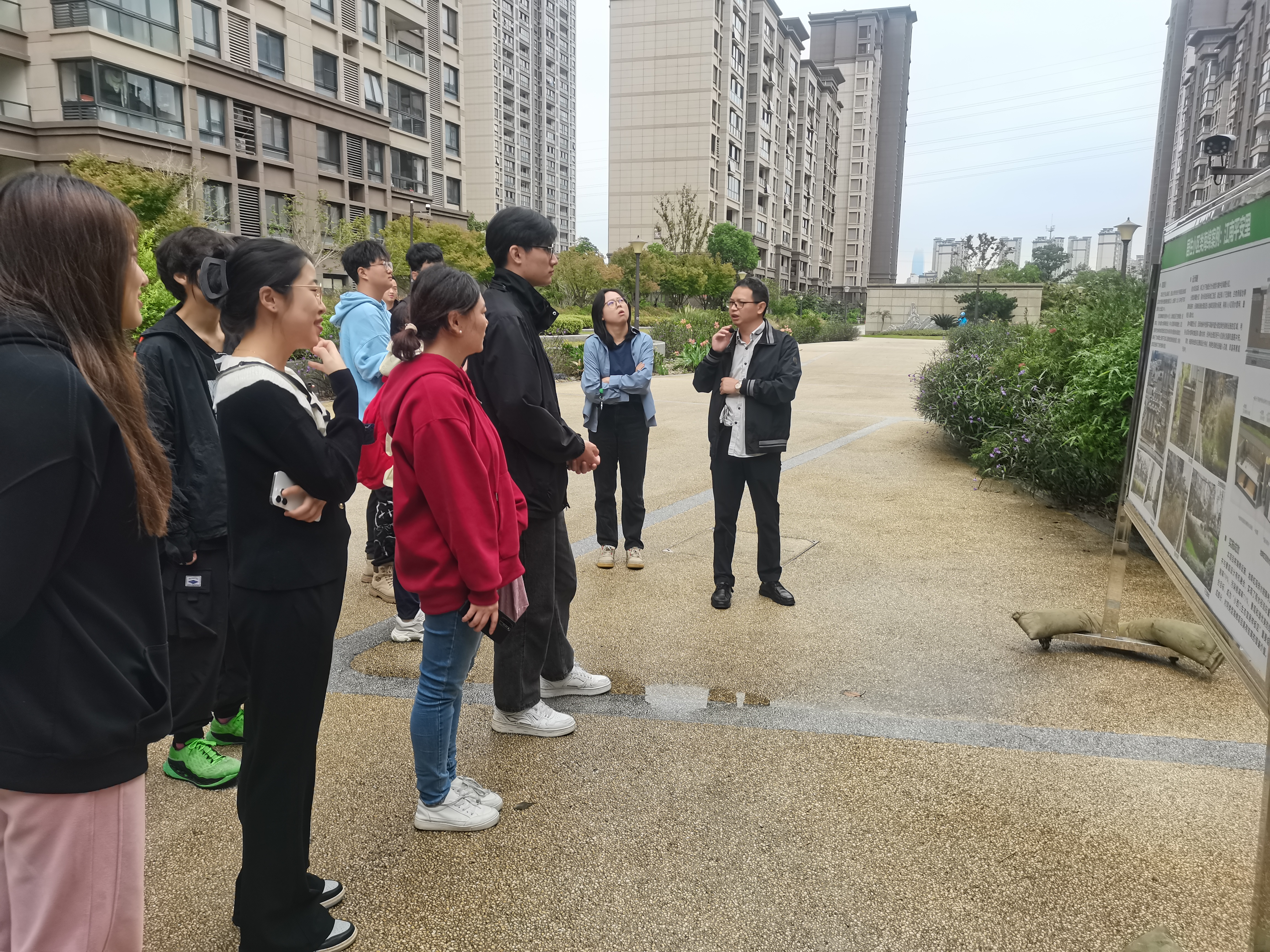 随后,师生一行经由博士路到达江南平安里小区。张海军结合江南平安里小区实际,为同学们详细讲解设计原理和落地的过程。项目运用了生物滞留池、植草沟、雨水蓄水池等海绵设施,并与小区景观环境深度融合,将地库顶板虹吸式排水系统与雨水滞留池排水层相结合,解决了地库覆土深度不足难以设置渗透型海绵设施的问题。