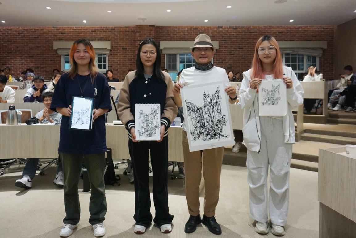 为了让师生更加直观地感受钢笔画的魅力,唐老师现场为大家演示了一幅欧洲建筑的钢笔画创作过程。他手法娴熟,线条流畅,一幅栩栩如生的欧洲建筑手绘便呈现在师生眼前。师生们纷纷惊叹于唐老师的技艺之高超,掌声雷动。