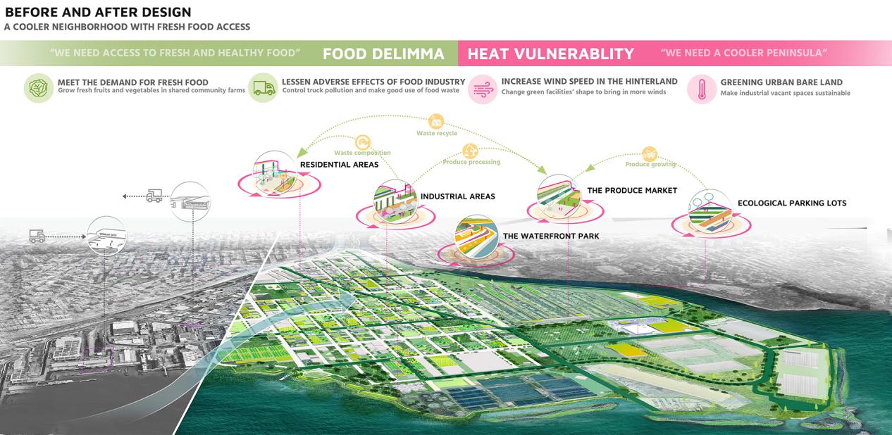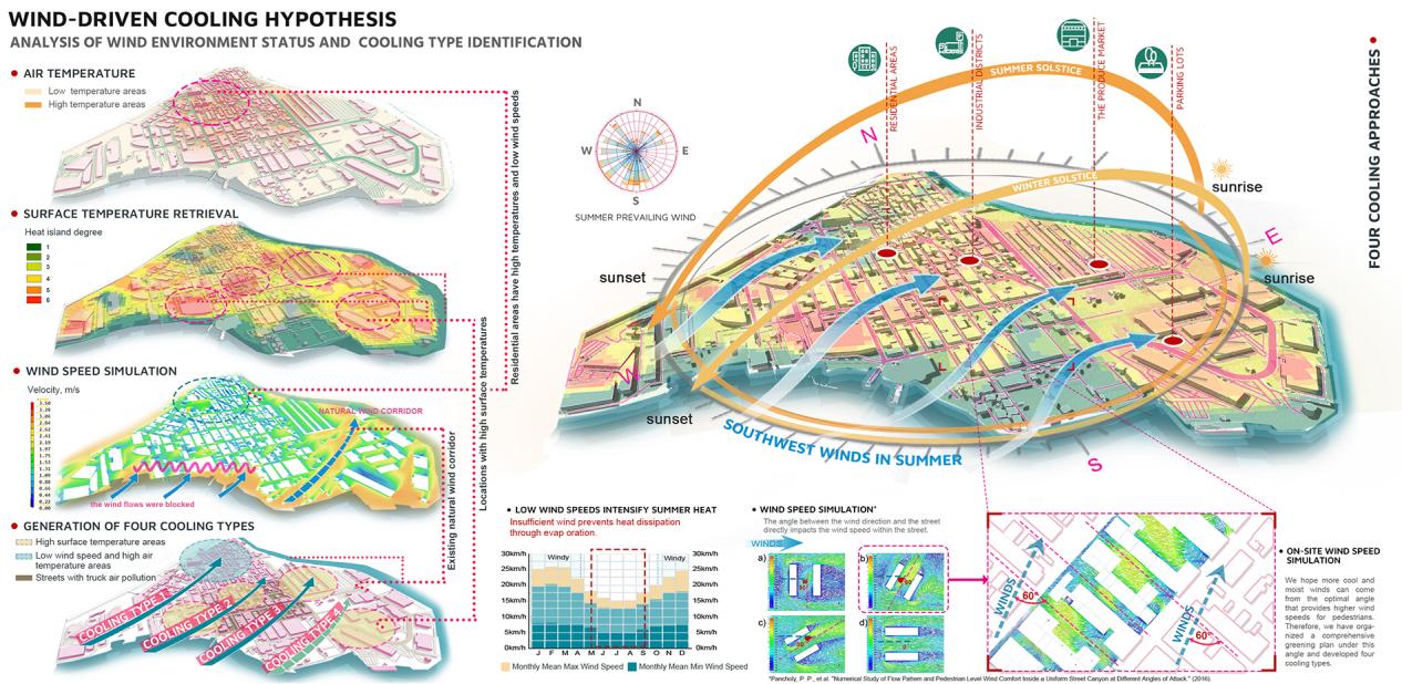 “The overarching idea of solving two issues, urban island heat and access to fresh food by an urban agricultural intervention, designed to channel cooling breezes, is intriguing. The jury was impressed by the thorough social and climatic analysis that served as the underpinning for the design solution. Beautifully crafted and detailed graphics helped to convey complex systems and ideas in an approachable and educational manner.