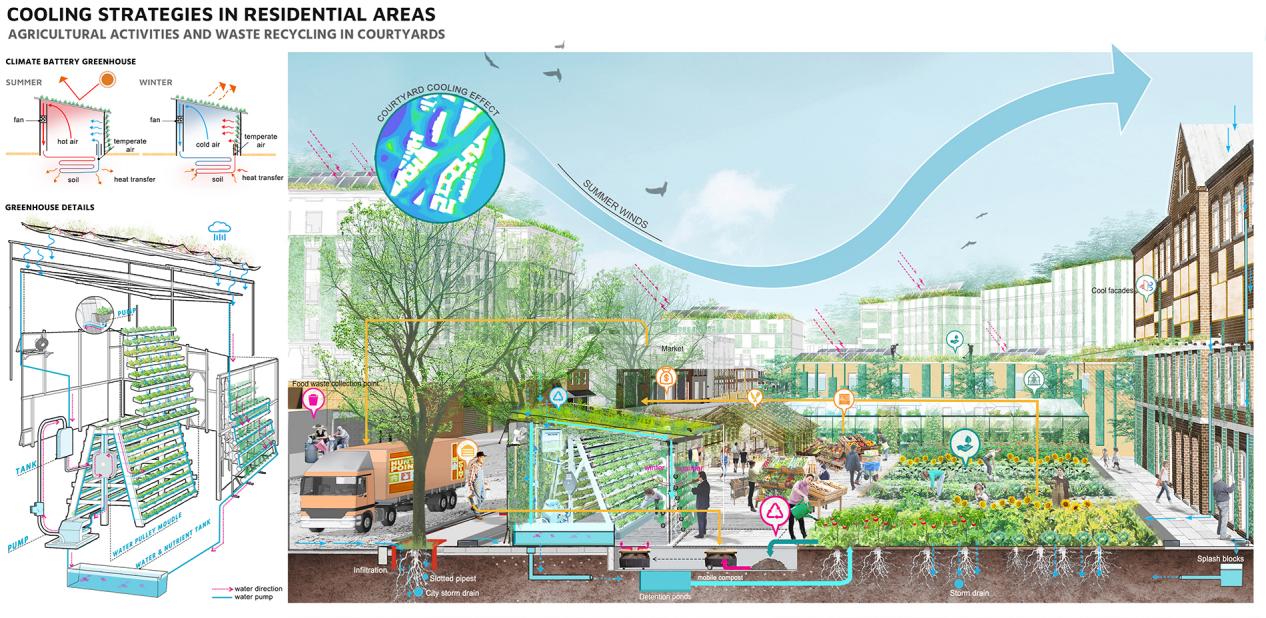 “通过城市农业干预来解决城市热岛问题和获取新鲜食物的整体思路令人着迷。评审团对深入的社会和气候分析印象深刻,这为设计解决方案提供了坚实的基础。精美制作和详细的图形有助于以平易近人和教育性的方式传达复杂的系统和想法。