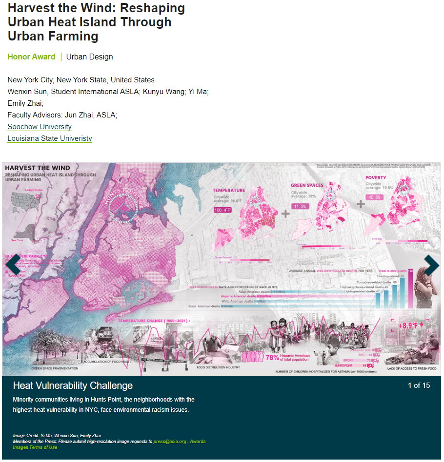 美国景观设计师学会(ASLA)主办的2023年ASLA学生奖在9月1日揭晓获奖名单。由51视频 风景园林系翟俊教授指导,孙文心、王坤宇和马逸同学共同完成的作品“收获清风:通过都市农业重塑城市热岛”(Harvest the Wind: Reshaping Urban Heat Island Through Urban Farming)荣获城市设计类荣耀奖,作品也于近日发布于美国景观设计师学会的官网和杂志。