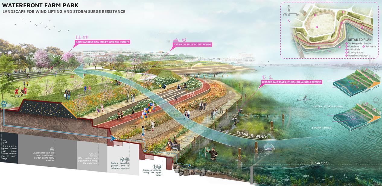 这是苏大风景园林专业研究生继连续斩获2020年和2021年4项大奖之后第5次获得该奖项。本次获奖的设计方案回应了环境种族主义话题,聚焦在一个极受高温威胁的纽约贫困社区Hunts Point。该方案同时回应了场地中有关新鲜食品的困境,创意性地提出将城市农业作为解决城市热岛效应问题的解决方案。在对该社区中的气候条件和绿地潜力做充分分析后,设计团队将“风”作为破题线索,给出了一个同时能够满足当地居民对舒适环境和健康营养新鲜食物两个需求的景观规划设计方案。