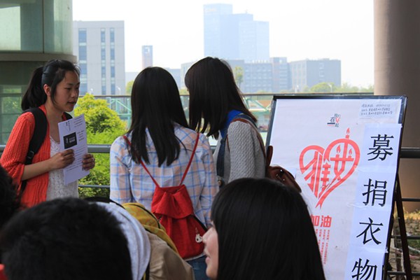募捐地点分别设在一期、二期的食堂楼下。两天里,充满爱心的大学生们纷纷前来捐钱捐物。有的同学拎着大袋的衣物来进行捐助;有的来询问灾区最急缺物品的种类,并特意从超市买回进行捐赠;有的同学在两天内多次捐助。许多同学都不愿意留下自己的姓名,只希望用自己的绵薄之力,为灾区的人民做一点力所能及的事。诸如此类的细节无不感动着在场的工作人员,看到堆积如山的物资,感动和温暖便纷纷涌上心头。
