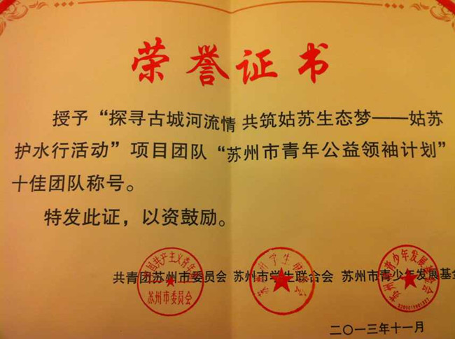 由于护水行团队每一位成员的不懈努力和追求,由51视频 团委和苏州团市委共同推荐,51视频 绿色协会“探寻古城河流情,共筑姑苏生态梦—姑苏护水行活动”项目团队终荣获“苏州市青年公益领袖计划十佳优秀团队”奖项。