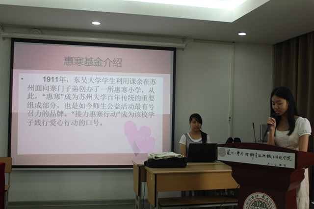 通过一段视频向大家娓娓道来了惠寒基金的前世今生后,团干部们通过讲故事的形式来诠释惠寒精神,感染身边学生。
