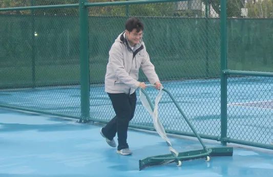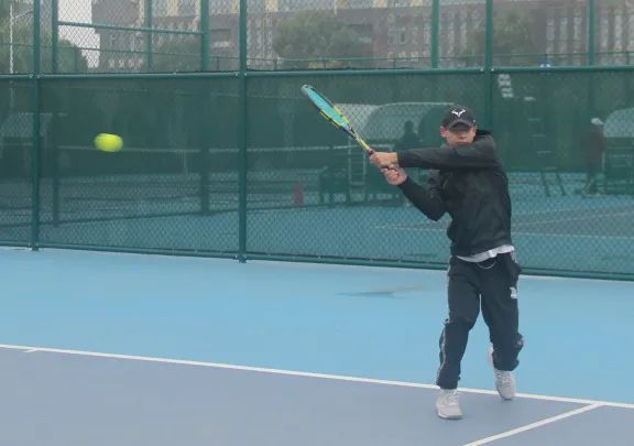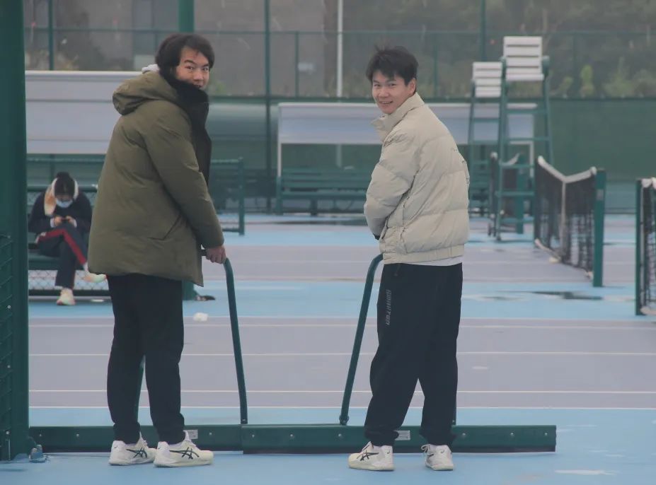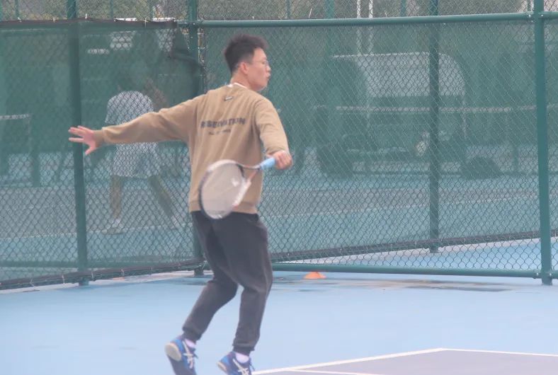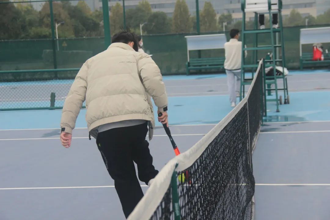 因为热爱,所以坚持。赛程当日一早下起小雨,直至早上八点半左右才确定正常开赛。赛事工作组雨一停就集合到场地上清理积水。令人动容的是,虽然室外气温仅12℃,还刮着大风,但每一位运动员都秉持着对网球的热爱和对手最大的尊重,全力去打好每一场球。