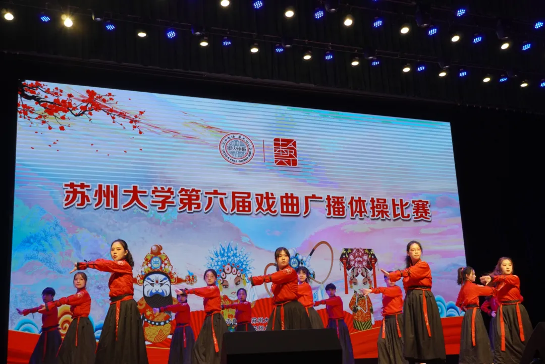 伴随着戏曲广播体操的音乐响起,同学们动作刚柔并济,身韵合一,极具古典风格又不失轻快活泼。队形变换灵动唯美,他们的表演带领我们走进戏曲天地之中。两位同学侧手翻入场进行高难度展示,逐渐将节目推向高潮,惊起台下一片欢呼声。