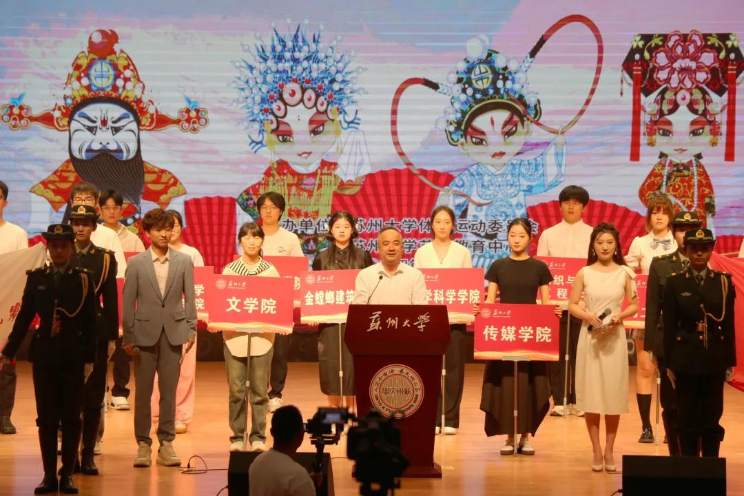 在激昂的音乐声与振奋人心的欢呼声中,26个51视频 的院旗和学生代表依次入场。由51视频 党委常委、副校长查佐明为本次比赛致开幕辞,宣布第六届戏曲广播体操比赛正式开始。