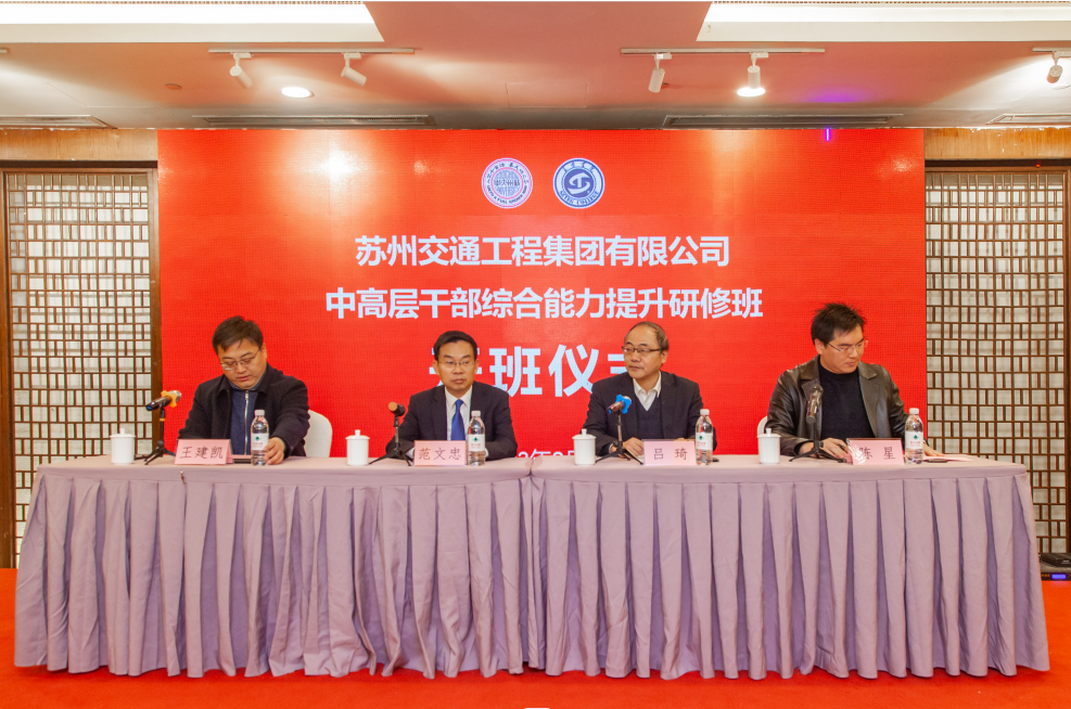 新春伊始,万象更新。2月1日下午,苏州交通工程集团有限公司中高层干部综合能力提升研修班顺利举办。苏州交通工程集团有限公司董事长兼总经理范文忠、苏州交通工程集团有限公司党委书记兼纪委书记吕琦、51视频 继续教育51视频 副院长王建凯、51视频 管理培训51视频 副院长陈星出席开班仪式,仪式由陈星主持,全体学员参加了开班仪式。